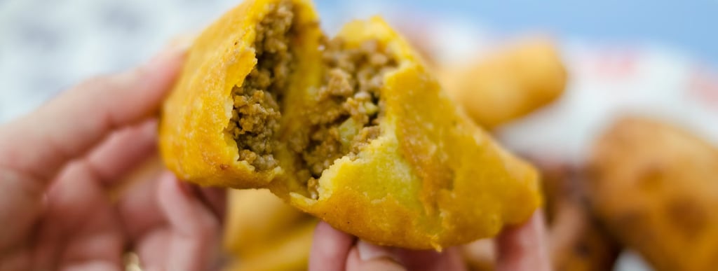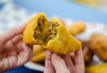 Pâte de manioc croquante cuite avec une farce élaborée avec de la viande de bœuf, des oignons, de la tomate et du poivron.